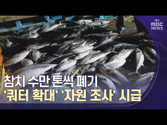◀앵커▶동해안에 참치가 급증했지만 한정된 어획 쿼터량 때문에 해마다 수만 톤씩 버리고 있습니다.국제기구의 쿼터량 확대가 근본적인 해법이기는 한데, 어민들은 우선 대형 선망에 몰려 있는 쿼터량을 정치망에도 배분하고, 그물에 걸려 죽은 참치는 합법적으로 유통할 수 있도록 제도 개선을 바라고 있습니다.김형일 기자...