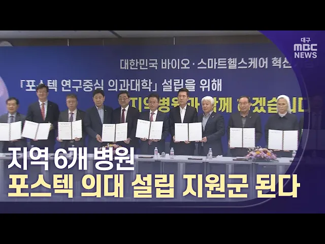 ◀앵커▶포항시와 포항공대가 함께 추진 중인 연구중심 의과대학 설립 및 의사과학자 양성 프로젝트에 지역 6개 병원이 힘을 보태기로 했습니다.지역 대형 병원들이 경쟁 상대가 될 수도 있는 의대 설립을 돕는 것은 이례적인 일로, 포스텍 의대 설립에 힘이 실리고 있습니다.이규설 기잡니다. ◀기자▶경상북도와 포항시 그리...