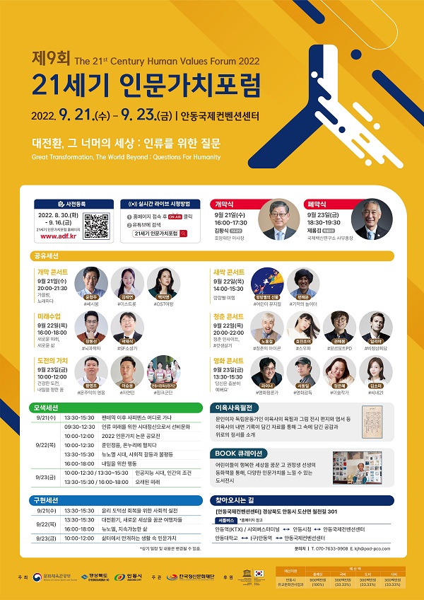 '21세기 인문가치 포럼'이 '대전환, 그 너머의 세상'을 주제로 9월 21일 안동 국제컨벤션센터에서 개막해 사흘 동안 계속됩니다.이번 포럼은 코로나 19 팬데믹 이후, 사회 전반에서 일어나고 있는 변화 속에 인류가 살아가야 하는 방향과 해답을 모색하는 시간으로 20개 세션에 전문가 100명이 참가합니다.개막식에서는 국...
