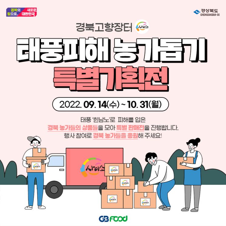 경상북도는 경북 고향장터 '사이소'를 통해 태풍 힌남노 피해 농가를 돕기 위한 특별기획전을 개최합니다.사이소 입점 농가 가운데 14개 태풍 피해 농가에서 생산된 과일과 가공식품을 최대 50% 할인 판매합니다.또 기부금품 자율 모금과 피해 농가 제품 오프라인 판매 행사도 함께 진행할 예정입니다.(사진 제공 경상북도)