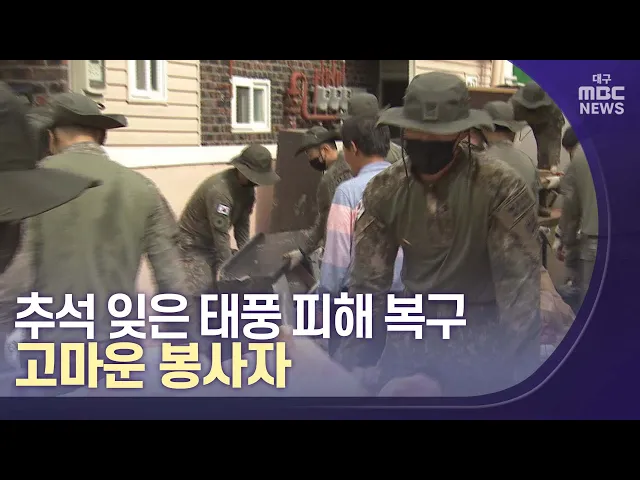 ◀앵커▶추석 연휴가 시작됐지만 태풍으로 큰 피해를 입은 포항에서는 일상으로 돌아가기 위한 복구 작업이 계속됐습니다.전국에서 군인과 자원봉사자 등 1만 명이 포항을 찾아 피해 복구에 힘을 보탰습니다.이규설 기잡니다. ◀기자▶이번 태풍에 성한 집이 없는 포항시 대송면 제내리! 골목마다 못쓰게 된 물건들이산더미처럼...