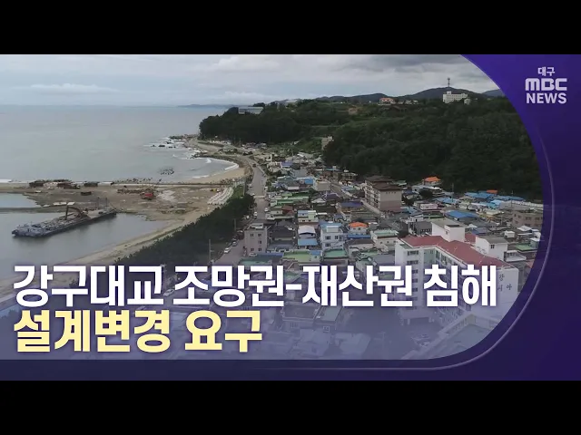 ◀앵커▶경상북도가 영덕 강구항 일대의 상습적인 교통난 해소를 위해 해상 대교를 건설하고 있습니다.그런데 인근 마을 주민들은 대형 구조물이 해안 조망권을 침해해 땅값 하락에 따른 재산권 피해를 걱정하고 있습니다.어민들도 대형 교각 때문에 어선 충돌 사고가 우려된다며 설계 변경을 요구하고 있습니다.김형일 기자...