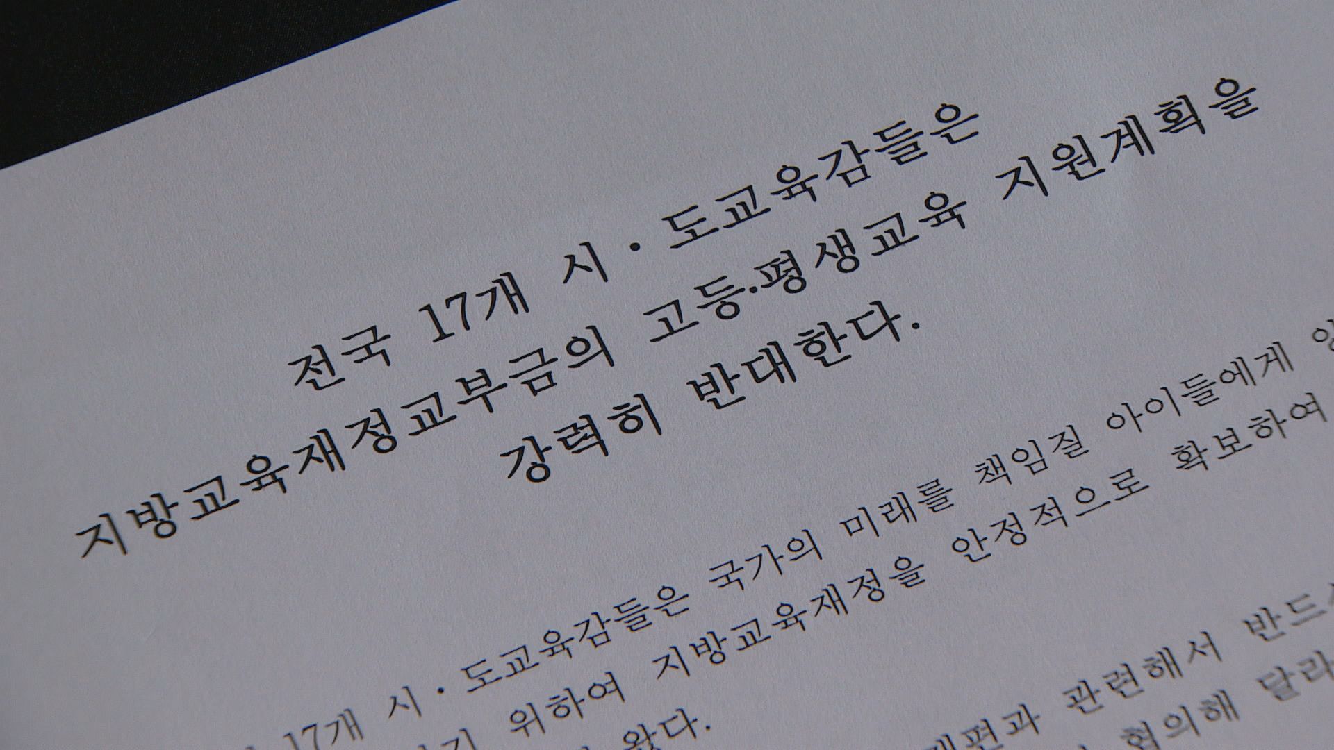 정부가 그동안 유치원이나 초중고에 지원하던 '교육교부금'을 대학 교육에 할애하기로 결정한데 대해 시도교육감들이 강하게 반발하고 있습니다.시도교육감협의회는 정부가 첫 국가재정전략회의를 통해 지방교육재정교부금 중 3조 6천억 원을 대학 교육에 지원하기로 한 것에 대해, 사전에 아무런 협의도 없이 이뤄진 결정...