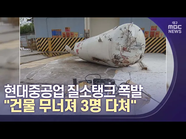 ◀앵커▶경북 경주시에 있는 현대 중공업 공장에서 질소 탱크가 폭발하는 사고가 발생했습니다. 폭발의 충격은 엄청났는데요,바로 옆 공장 건물이 무너지면서 직원 3명이 중경상을 입었고, 탱크는 100미터나 날아가서 떨어졌습니다.배현정 기자가 보도합니다. ◀기자▶경북 경주시 외동읍에 있는 현대중공업 해양 배관 공장. 오...