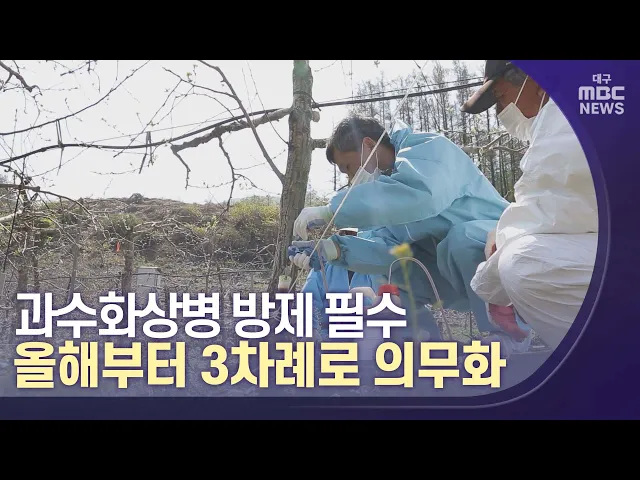 ◀앵커▶사과나 배나무에 생기는 '과수화상병'. 불에 탄 것처럼 나무가 검게 말라 죽는다고 해서 붙여진 이름이죠,과수화상병의 방역 체계가 사전 예방으로 바뀌는데요,올해부터 방제 횟수가 세 차례로 늘고, 피해를 막기 위한 기술도 총동원됩니다. 이도은 기자입니다. ◀기자▶사과 주산지인 경북에서는 2021년 안동과 영주 ...