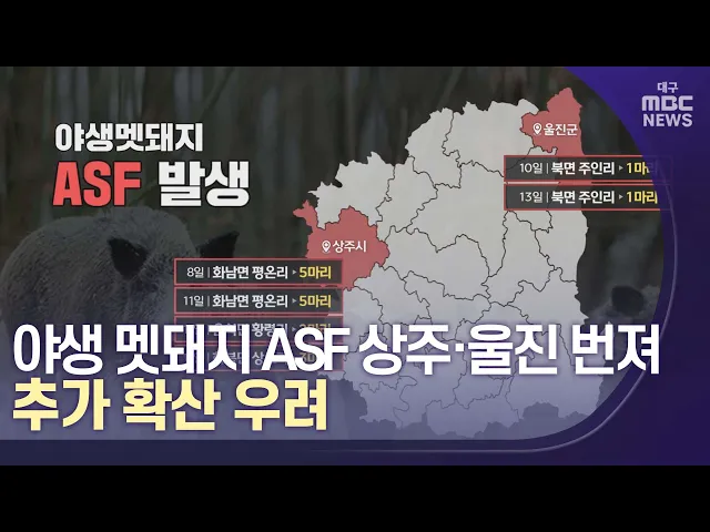◀앵커▶ 경북지역에서 아프리카 돼지열병이 급속히 확산하고 있습니다.지난주 경북 상주에서 처음으로 아프리카 돼지열병에 걸린 야생 멧돼지 폐사체가 발견됐는데요, 울진에서도 감염된 폐사체가 나왔습니다.바이러스 전파 속도가 빨라지면서 불과 일주일 만에 감염된 멧돼지는 17마리로 늘었습니다.김건엽 기자가 보도합니...