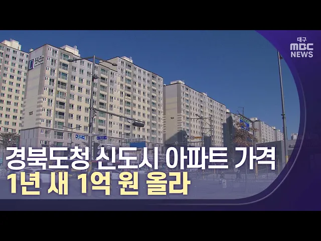 ◀앵커▶전국적으로 아파트 가격이 크게 오르면서 경북도청 신도시의 아파트값도 최대 1억 원, 50% 넘게 오른 것으로 나타났습니다.전문가들은 올해는 가격 상승률이 그렇게 높지는 않을 거로 내다봤습니다.김경철 기자◀김경철 기자▶경북도청 신도시에 있는 한 아파트 단지. 2019년 입주 당시 34평 기준으로 2억 5천만 원이었...