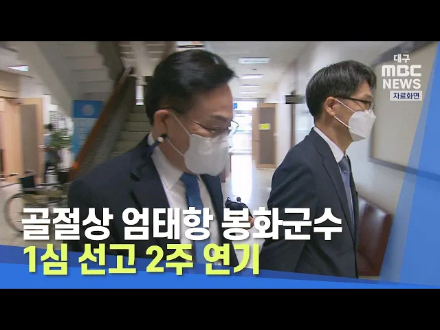 9억 원 대의 뇌물 수수 등의 혐의로 징역 12년을 구형받은 엄태항 봉화군수에 대한 1심 선고가 2주 연기됐습니다.엄 군수가 지난달 25일, 자신의 차량에 치여 골절상을 입은 것과 관련해 엄 군수 측 변호인이 법원에 선고 기일 변경을 신청했고, 법원이 오늘 이를 받아들였습니다.2주 연기된 1심 선고는 오는 28일 대구지방...
