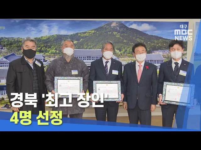 경상북도가 지역 최고 기술자 4명을 '최고 장인'으로 선정했습니다.선정된 최고 장인은 도자기 직종에 '청광요' 김외준씨, 기계정비 직정 신재석, 건축 목공시공 김진식·김경천씨입니다.최고 장인에 선정되면 5년간 매월 30만 원의 기술장려금이 지급되고 작품전시회 등 다양한 지원을 받을 수 있습니다.