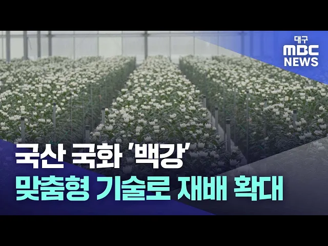 ◀앵커▶국산 국화 품종인 '백강'이 일본산 품종을 대체하며 재배면적이 늘어나고 있습니다.지역 맞춤 스마트 재배 기술까지 보급되면서 내수는 물론 수출시장에서도 각광받고 있습니다.김건엽 기자가 보도합니다.◀기자▶2015년 개발된 국산 국화 백강입니다. 잎에 황색 점무늬가 생겨 상품성을 떨어트리는 '흰녹병'을 극복한 ...