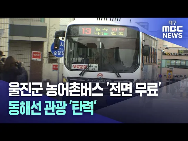 ◀앵커▶경북 울진군이 3월 17일부터 모든 노선의 농어촌버스를 전면 무료로 운행하기 시작했습니다.주민뿐만 아니라 관광객들도 무료여서 동해선 철도를 이용하는 관광객 유치에도 효과가 있을 것으로 기대됩니다.장성훈 기자가 보도합니다. ◀기자▶경북 울진군의 농어촌버스가 조례 제정을 통해 전면 무료 운행을 시작했습니...