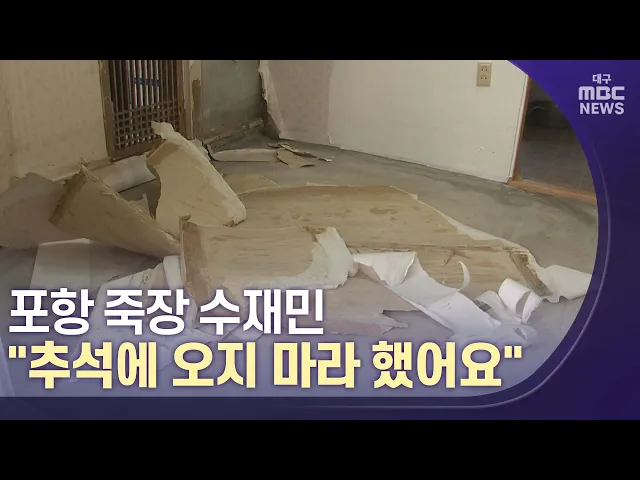 ◀앵커▶추석 연휴가 일주일도 채 남지 않은 요즘, 모두들 추석을 준비하느라 마음이 분주하지만 엄두조차 내지 못하는 곳이 있습니다.바로 태풍이 휩쓴 포항시 죽장면 얘기입니다. 수재민들은 추석 차례는 고사하고, 귀성객을 돌려 보내야 할 형편입니다. 배현정 기자가 수해 현장을 취재했습니다.◀배현정 기자▶지난달 24일 ...