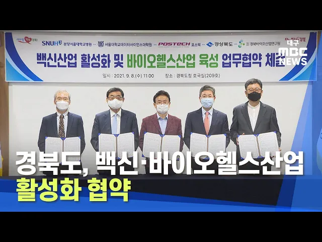 경상북도가 분당서울대병원, 서울대 데이터사이언스대학원, 포스텍, 경북바이오산업연구원과 백신·바이오헬스산업 육성을 위한 업무협약을 체결했습니다.이번에 업무협약을 맺은 각 기관들은 백신과 바이오헬스 분야에서 인프라 공유·연구 협력, 빅데이터 구축, 인재 양성과 인력 교류 등 다각적인 상호 협력을 추진할 계획...