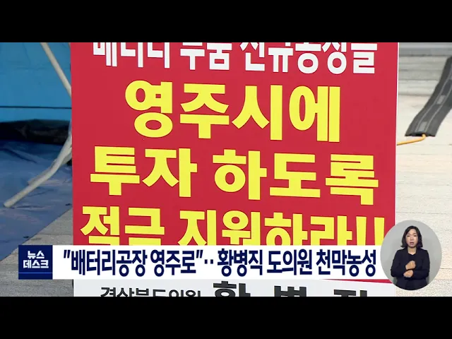 영주 지역구 황병직 경북도의원이 SK머티리얼즈의 상주 배터리 소재 공장 추진에 반발해 이틀째 경북도청 앞에서 천막농성을 벌이고 있습니다.황 의원은 SK머티리얼즈 측에 지금이라도 배터리 공장을 본사가 있는 영주로 추진하라며, 오는 14일로 예정된 경북도, 상주시 간 투자협약을 취소할 것을 촉구했습니다.차기 영주...