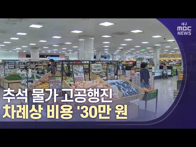 ◀앵커▶추석이 2주 앞으로 다가온 가운데, 식품 물가는 고공행진을 이어가고 있는데요. 올 추석 차례상 차림에 드는 비용도 지난해보다 크게 올라, 4인 가족 기준으로 평균 30만 원가량이 들 것으로 보입니다.◀김경철 기자▶올해 추석 차례상 차림에 드는 비용은 지난해보다 10% 가까이 증가할 것으로 예상됩니다.수확철을 앞...
