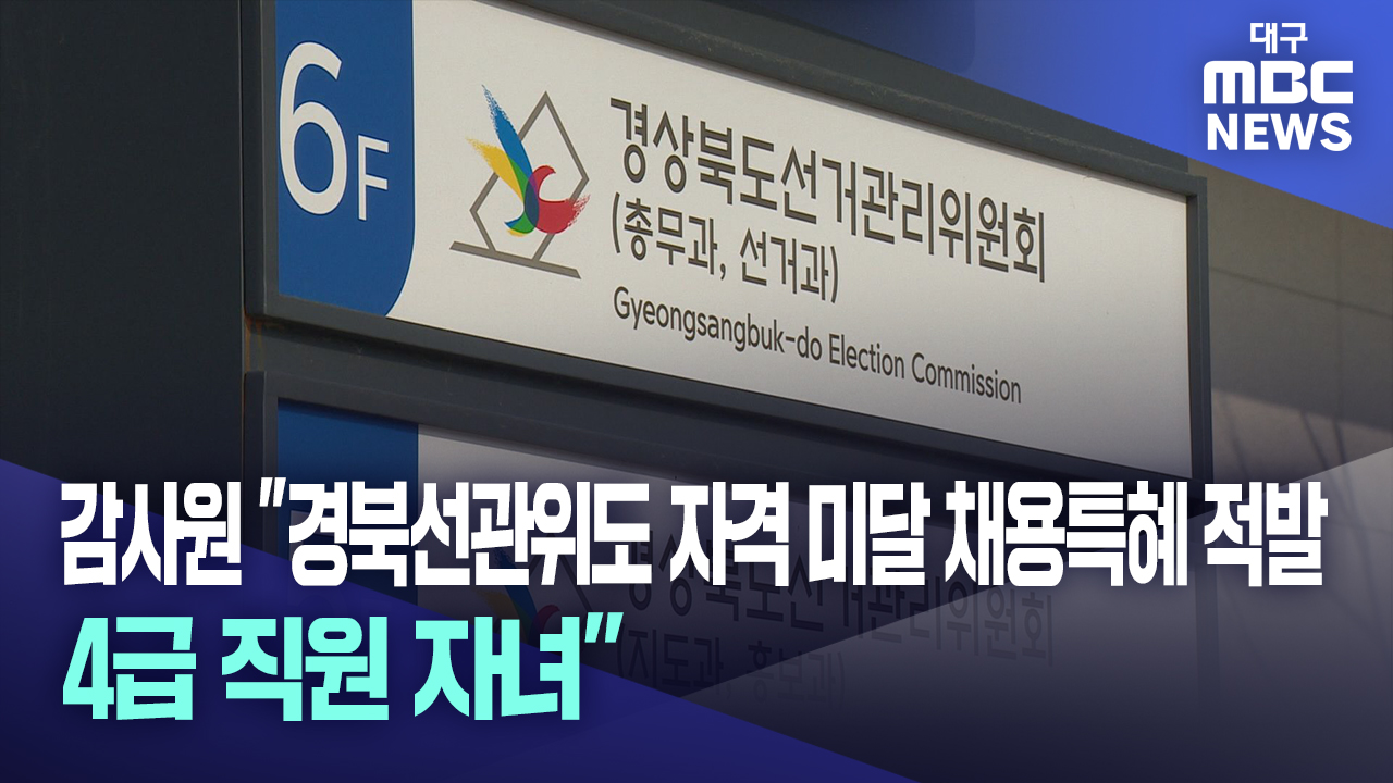 ◀앵커▶감사원이 최근 선거관리위원회의 채용 비위 의혹을 감사한 결과를 발표했는데요.경북 선관위에서도 4급 서기관으로 퇴직한 직원의 자녀에 대한 특혜 채용이 확인됐습니다.감사원은 해당 채용을 주도한 선관위 직원에 대해 중징계를 요구했습니다.김서현 기자 ◀기자▶이듬해 대통령선거와 지방선거까지 양대 선거를 앞...