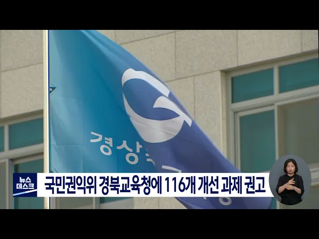 국민권익위원회가 지난 2천13년부터 경북교육청에 116개 개선 과제를 권고한 것으로 나타났습니다.경북교육청은 이가운데 97%인 112개 과제를 이행 완료했고, 현재 4개 과제를 이행중이라고 밝혔습니다.이행중인 과제는 공공 기관 변호사 선정과 운영의 투명성, 사설 독서실 남녀 좌석 구분 규정 개선, 성범죄 음주 운전 징...