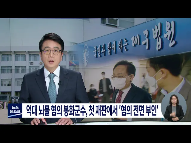 ◀ANC▶관급공사 수주에 편의를 제공하고 건설업자로부터 수억 원의 뇌물을 받은 혐의 등으로 기소된 엄태항 봉화군수에 대한 첫 재판이 열렸습니다.엄 군수는 뇌물수수와 직권남용 등 검찰이 적용한 혐의를 전면 부인했습니다.김경철 기자 ◀END▶ ◀VCR▶수억 원대의 뇌물수수 혐의를 받는 엄태항 봉화군수가 첫 재판...