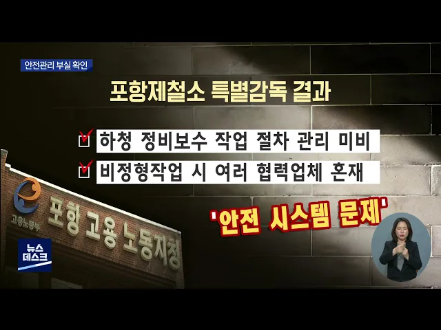 ◀ANC▶포스코 포항제철소에서는 지난 석달 동안 세 명의 노동자가 잇따라사고로 숨졌습니다.사고가 날 때마다 포항제철소의 부실한 안전 관리 시스템이 문제로 지적돼 왔는데요. 지난 두 달간 이뤄진 고용노동부 특별 감독 결과,2백여 건의 위법 사항이 적발됐습니다. 박성아 기자가 보도합니다. ◀END▶ ◀VCR▶지난...