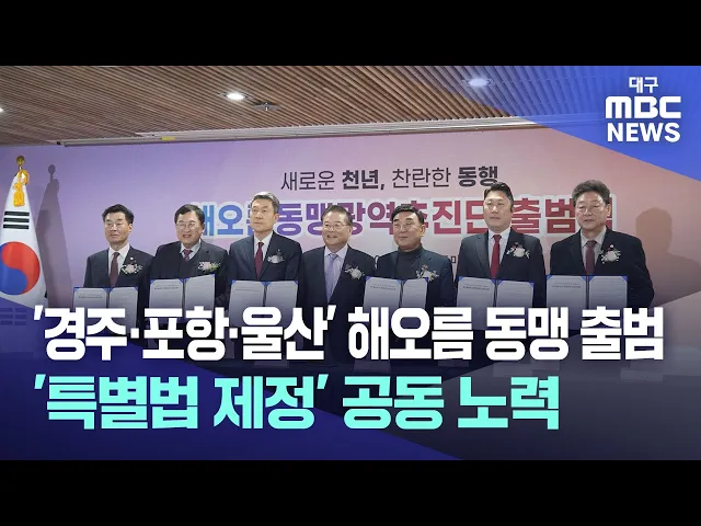 ◀앵커▶경북 경주시와 포항시, 울산시가 동해안 초광역 경제 동맹을 위해 해오름 동맹 추진단을 출범시켰습니다. 수도권 집중화에 맞서 3개 지자체가 협력해 동해안 초광역 산업 생태계를 구축하고, 국토 균형 발전의 새로운 모델을 제시하겠다고 밝혔습니다.김형일 기자가 보도합니다. ◀기자▶경북 경주시와 포항시, 울산시...