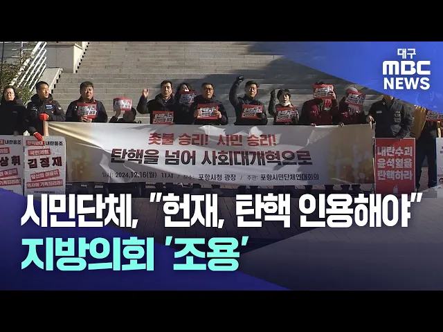 ◀앵커▶윤석열 탄핵 소추안이 가결된 가운데 포항 지역 시민단체들이 헌법재판소의 조속한 탄핵 인용 판결과 윤석열이 거부해 온 민생 법안의 신속한 처리를 촉구하고 나섰습니다.이런 시민들의 잇단 입장 표명과 달리 국민의힘 소속이 절대다수인 지방의회는 조용합니다.장성훈 기자가 보도합니다.◀기자▶국회가 윤석열 탄핵...
