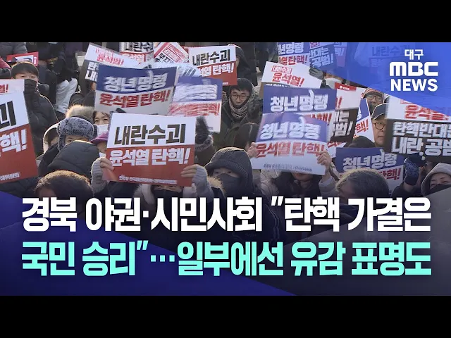 ◀앵커▶윤석열 대통령 탄핵소추안 가결과 관련해 경북에서도 환영의 목소리가 나오고 있습니다.야당과 시민사회단체는 일제히 "국민의 승리"라며 헌법재판소의 조속한 결정을 촉구한 가운데, 유감을 표명한 여당 소속 단체장도 있었습니다.엄지원 기자가 보도합니다.◀기자▶탄핵안 가결의 순간, 환호성이 터져 나옵니다.◀현장...