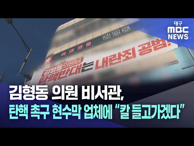 ◀앵커▶대통령 탄핵 표결에 불참한 국민의힘 의원들에 대한 비판이 커지는 가운데, 안동에서 김형동 의원 인턴 비서관이 탄핵 촉구 현수막 제작 업체에 폭언을 한 사실이 확인됐습니다.안동의 김 의원 사무실 앞에 '탄핵 촉구 현수막'이 내걸리자 해당 비서관이 현수막 업체에 직접 전화해 "칼을 들고 찾아간다"고 협박한 겁...