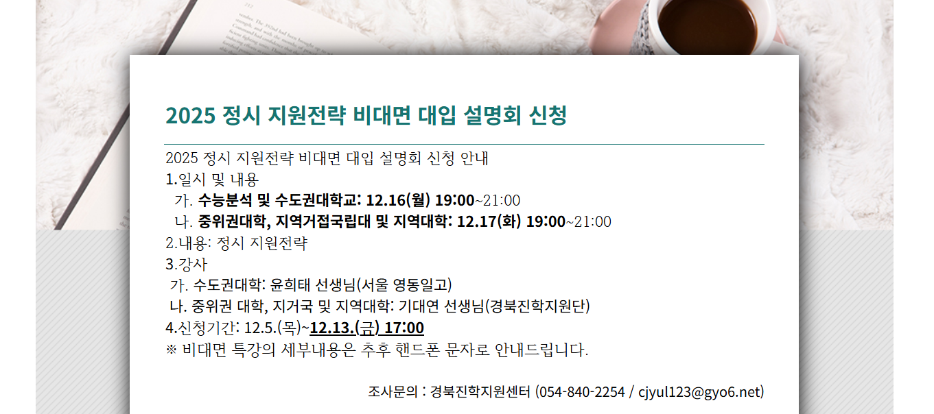 경북교육청은 도내 고등학교 3학년 학생과 학부모를 대상으로 '2025 대입 정시 지원 전략 설명회'를 오는 16일과 17일에 비대면으로 운영합니다.수능 분석과 수도권 대학은 16일 서울 영동일고 윤희태 선생님, 중위권 대학과 지역대학은 17일 경북진학지원단의 기대연 선생님이 설명합니다.설명회 참여를 희망하는 학생과 ...
