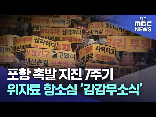 ◀앵커▶2017년 11월 15일, 포항에서 지열발전을 실증하다 촉발된 규모 5.4의 지진이 어느덧 7주기를 맞았습니다.지진피해 위자료 소송에서 승소하면서 2023년 50만 포항 시민 대다수가 소송에 참여했는데요.2심은 1년이 다 되도록 진전이 없자 포항 시민들이 재판 속행을 촉구하는 궐기대회를 열었습니다.김기영 기자가 보도...