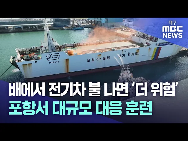 ◀앵커▶선박 내 전기차 화재는 제한된 공간에 차량이 밀집해 불이 다른 차로 옮겨붙기 쉽고 외부로부터 신속한 구조 지원도 어려워 더 위험할 수밖에 없는데요,포항에서는 선박 내 전기차 화재에 대응하기 위한 대규모 모의 훈련이 실시됐습니다.장성훈 기자입니다.◀기자▶포항과 울릉도를 오가며 차량 등을 주로 싣고 다니는...