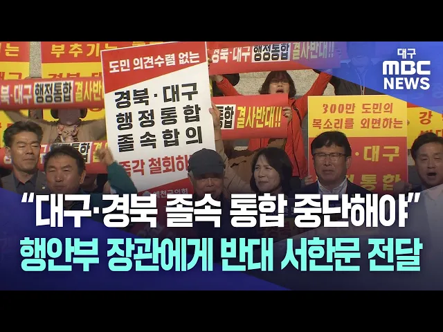 ◀앵커▶대구시와 경상북도의 행정 통합 작업이 본격화됐지만, 일부 시군을 중심으로 통합 반대 목소리가 커지고 있습니다.경북도청이 있는 안동, 예천 주민들과 의회 의장단이 10월 31일 행정안전부 장관의 포항 출장에 맞춰 포항에서 항의 집회를 열고 통합 반대의 뜻을 전했습니다.장미쁨 기자가 보도합니다.◀기자▶안동시...