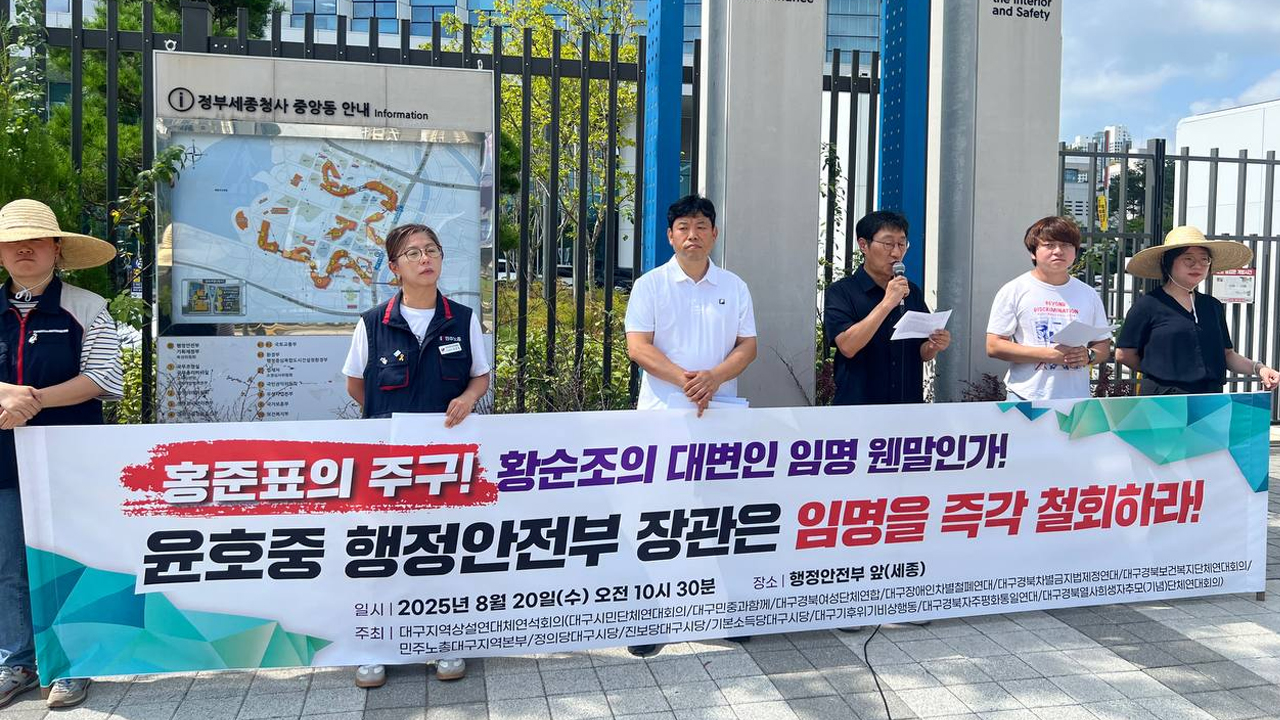 대구 상설 연대체 연석회의는 8월 20일 정부세종청사 행정안전부 앞에서 기자회견을 열고 홍준표 전 대구시장 체제에서 기조실장을 지낸 황순조 행정안전부 대변인 직무 대행의 임명 철회를 윤호중 장관에게 촉구했습니다.이들은 "황 대변인은 대구시 기조실장 시절 주민 정책 토론 청구 조례를 개악해 주민 참여 제도 취지...