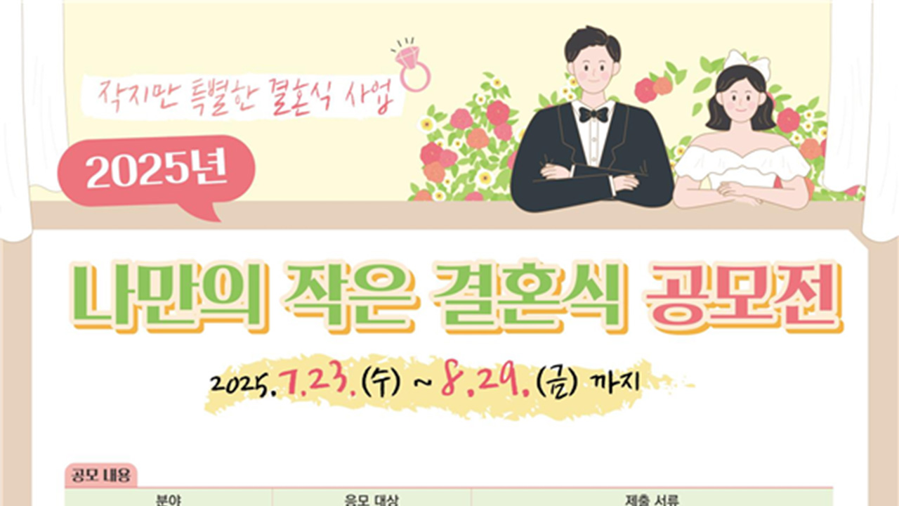 경상북도 나만의 작은 결혼식 공모전경상북도는 적은 비용을 들이는 작은 결혼식 문화를 정착시키기 위해 '나만의 작은 결혼식' 공모전을 엽니다.경북도민이라면 누구나 참여할 수 있고, 작은 결혼식 장소와 작은 결혼식 사례 공모로 진행합니다.결혼 장소 공모는 도내에 있으면서 작은 결혼식 장소로 활용할 수 있는 공공...