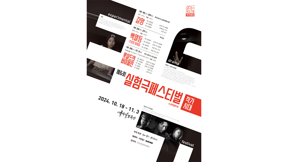 제6회 실험극 페스티벌이 10월 18일부터 11월 3일까지 대명공연 거리에 있는 골목실험극장에서 열립니다. 2024년에는 참가 단체 3개가 직접 창작한 희곡을 준비했습니다. 해마다 소주제를 정해 다양한 분야를 접목해 '연극 재창조주의'를 실천해 오고 있는데, 2024년 소주제는 '작가시대'입니다. 첫 번째 참가작 '창작19다...