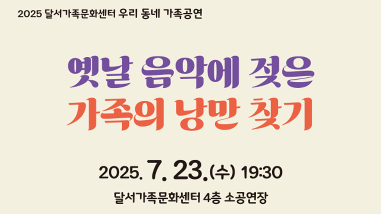 사진 제공 달서가족문화센터대구 달서가족문화센터는 여름 학기 두 번째 공연으로 7월 23일 저녁 7시 30분 국악·재즈 크로스오버 밴드 최찰랑이 낭만밴드와 함께 공연을 합니다. '우리 동네 가족 공연: 옛날 음악에 젖은 가족의 낭만 찾기'란 이름으로 암울했던 일제강점기를 배경으로, 그 속에서도 낭만이 피어났던 근대 ...