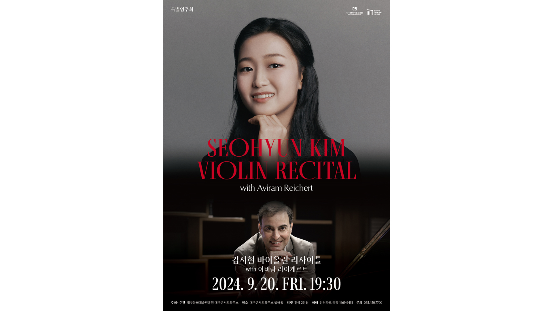 차세대 바이올리니스트 김서현이 9월 20일 저녁 7시 30분 대구 콘서트 하우스 챔버홀에서 리사이틀을 합니다. 김서현은 14세의 나이로 스위스의 '티보르 버르거 국제 콩쿠르'에서 역대 최연소로 우승했습니다. 공연에서는 슈만의 바이올린과 피아노를 위한 3개의 로망스, 라벨의 '바이올린 소나타 2번', 그리고 프랑크의 바...