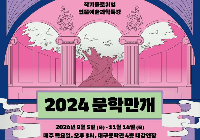 사진 제공 대구문학관대구문학관이 9월 5일부터 11월 14일까지 매주 목요일 오후 3시마다 대구 작가콜로퀴엄과 함께 인문 예술 과학 특강을 합니다. 모두 열 번 하는 특강은 각 분야의 저명인사를 초청해 인문학을 쉽고 재밌게 접근하는 방법을 듣습니다. 2024년은 '2024 문학만개'라는 주제로 작가들과 가수들을 초청해 문...