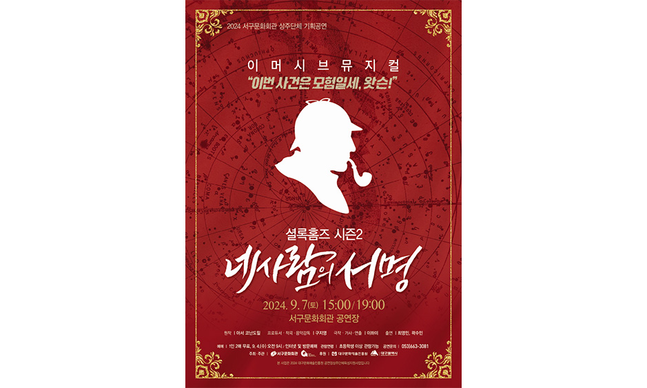 사진 제공 대구서구문화회관대구서구문화회관은 9월 7일 오후 3시와 7시에 뮤지컬 셜록 홈즈 시즌2 ‘네 사람의 서명’을 무대에 올립니다. 셜록 홈즈 시즌2, ‘네 사람의 서명’은 관객 참여형 공연으로 셜록 홈즈와 관객이 교감해 살인사건의 범인을 찾고 고대 보물의 진실을 풀어가는 작품입니다. 2024년 새로운 무대 세트를...