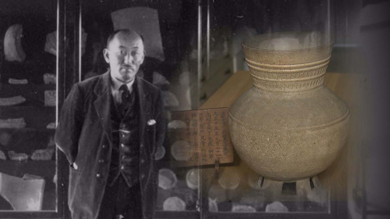 반출 사연 담은 신라 토기 영남대학교 문화인류학과 정인성 교수가 공개한 신라 토기는 원형 그대로 보존이 잘 된 '굽다리 긴목항아리'로 신라 고분에서 부장품으로 자주 발견되는 것이었습니다.이 토기를 소유하고 있던 '시게지로(重治郞)'라는 사람이 쓴 설명 판도 함께였습니다.설명 판에는 "군함 후루타카로 조선 동해...