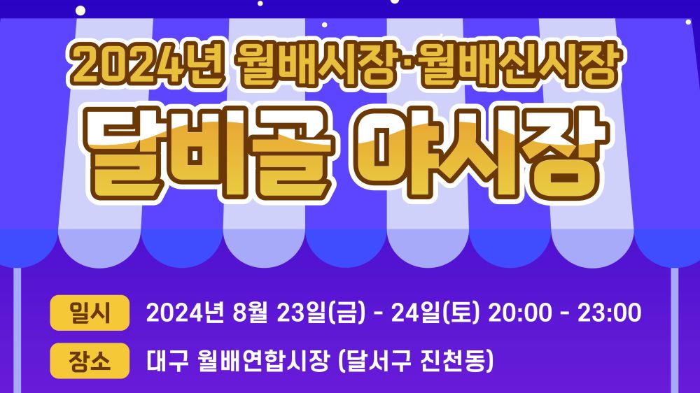 사진 제공 대구 달서구8월 23일과 24일 오후 8시부터 11시까지 대구 달서구 월배·월배신시장에서 야시장이 열립니다. 이번 행사는 중소벤처기업부에서 주관하는 문화관광형시장 육성 사업의 일환으로, 공연과 팝업스토어, 체험 행사 등도 진행됩니다. 대구 달서구는 2024년부터 2년간 최대 9억 원의 사업비를 투입해 관광지...