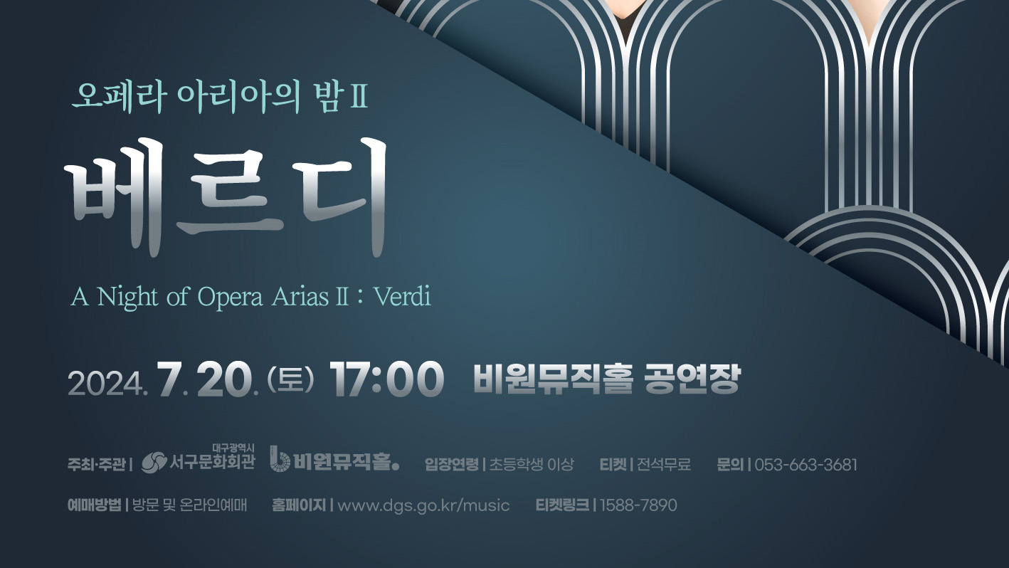 사진 제공 대구 비원뮤직홀대구 비원뮤직홀이 7월 20일 오후 5시에 '오페라 아리아의 밤 시리즈 두 번째 베르디'를 엽니다. 대구 서구에 있는 비원뮤직홀은 오페라 28개를 작곡해 '오페라의 아버지'라고 불리는 '베르디'의 작품 속에 나오는 주요 아리아를 연주합니다. 오페라 '일 트로바토레' 중 '고요한 밤은 평온하고', ...