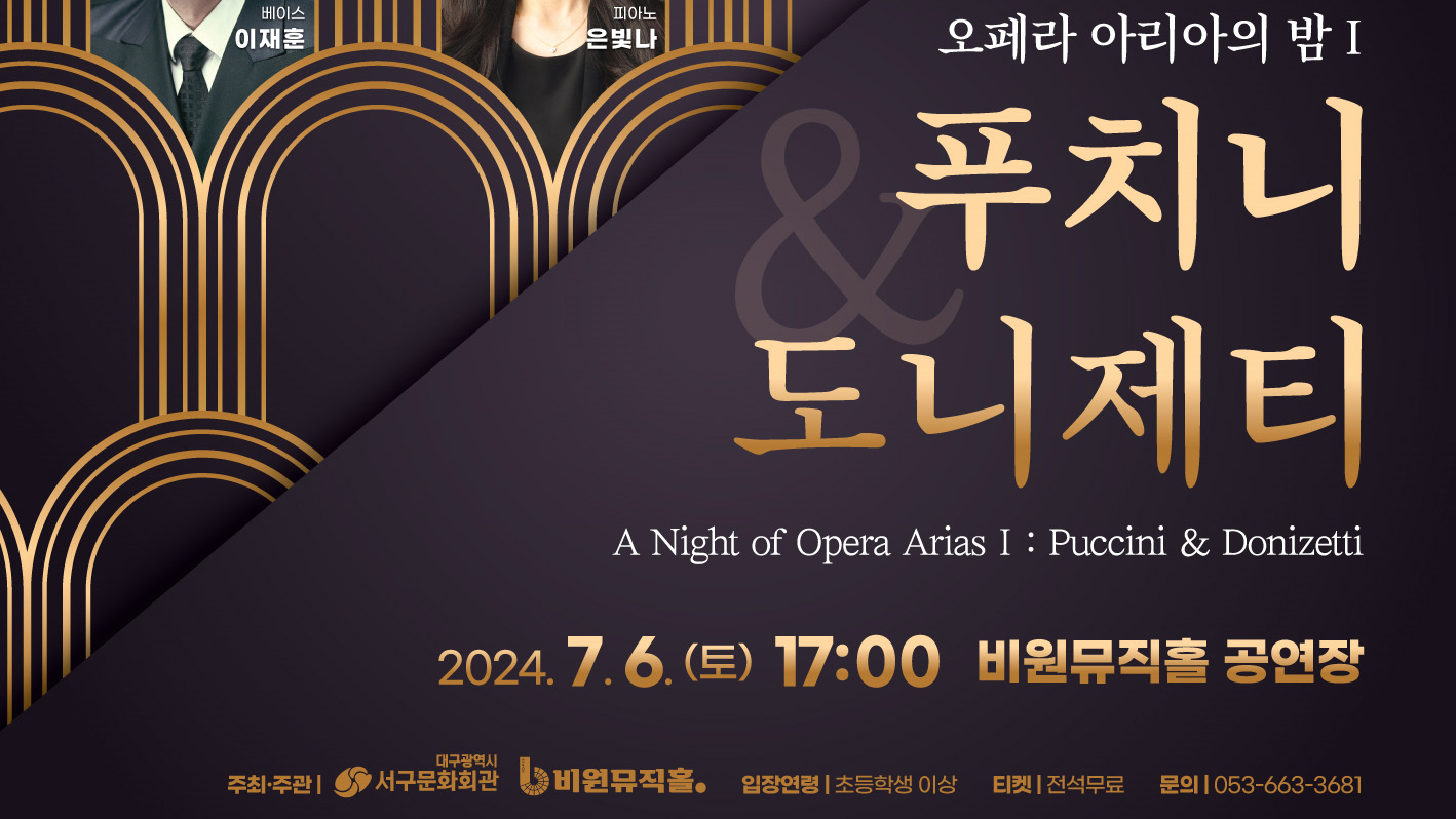 사진 제공 비원뮤직홀대구 서구 비원뮤직홀은 7월 6일 오후 5시에 오페라 아리아의 밤 시리즈로 푸치니와 도니제티’를 선보입니다. 오페라 작곡가 지아코모 푸치니와 가에타노 도니제티의 인기 오페라 속 아리아를 선별해 콘서트 공연으로 구성합니다. 공연은 소프라노 김상은, 김민진, 테너 윤병길, 석정엽, 바리톤 이동환...