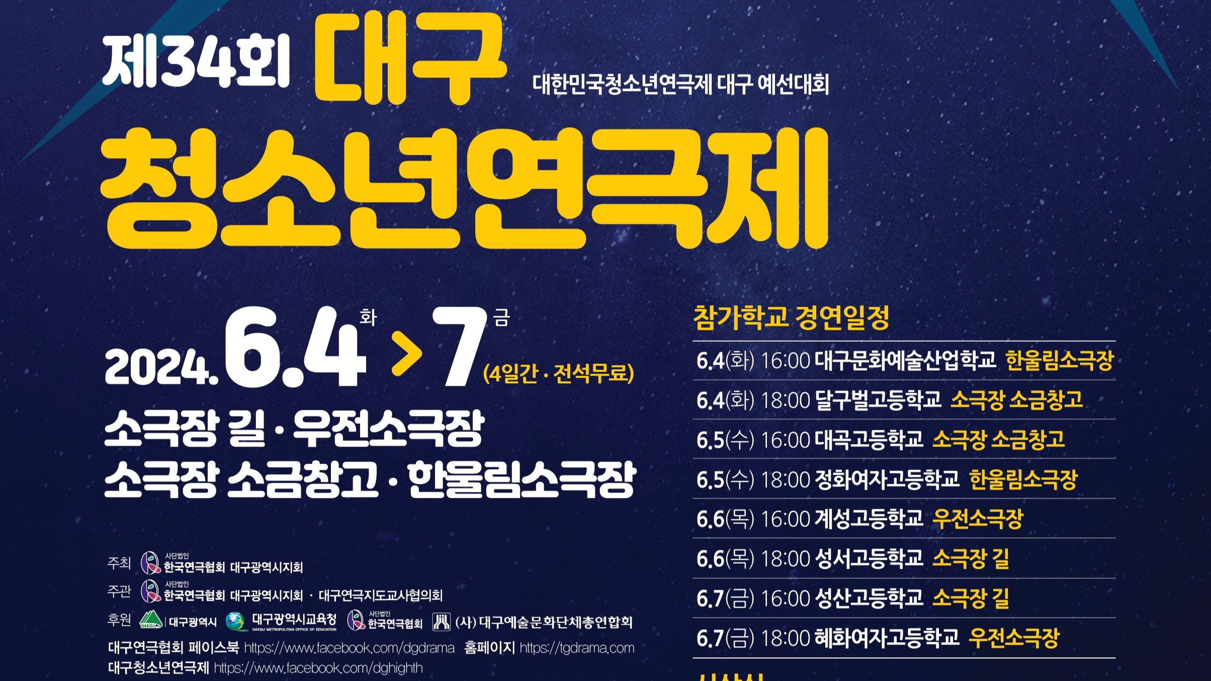 사진 제공 대구연극협회제34회 대구청소년연극제가 6월 4일부터 7일까지 대구연극협회 주최로 열립니다. 대구지역 8개 고등학교가 준비한 연극이 경쟁하는데, 대상작은 대한민국청소년연극제에 대구 대표로 나갑니다. 공연은 대명 공연 거리 안 우전 소극장과 소극장 길, 한울림소극장, 소극장 소금 창고에서 열립니다. 대...