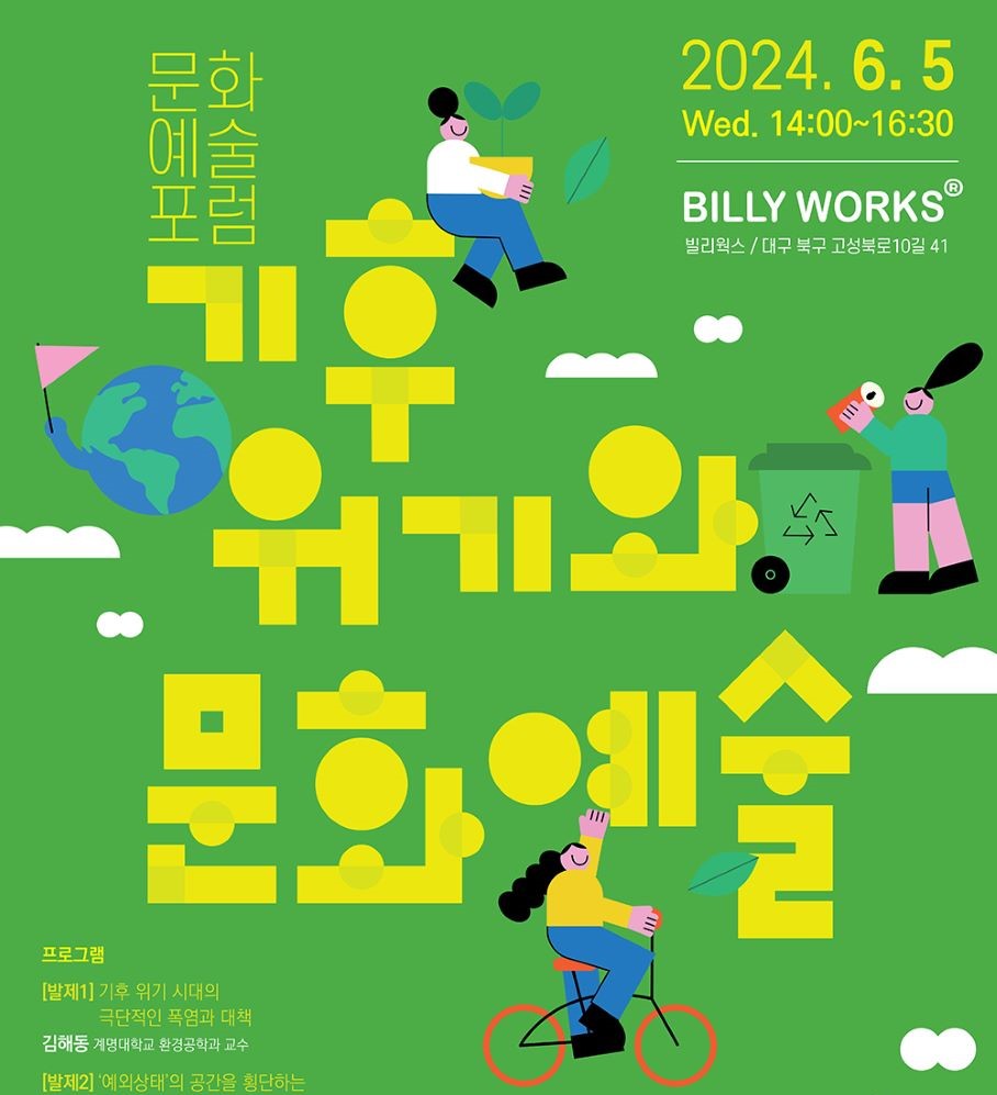 기후 위기와 문화 예술을 주제로 한 포럼이 6월 5일 오후 2시 대구 북구 복합문화공간 빌리웍스에서 열립니다.세계 환경의 날을 맞아 열리는 이번 포럼은 윤규홍 미술평론가가 모더레이터를 맡아, 최근 급격한 기후 변화로 예상되는 문제들과 이에 따른 문화 예술의 역할에 대해 살펴봅니다. 김해동 계명대 환경공학과 교수...