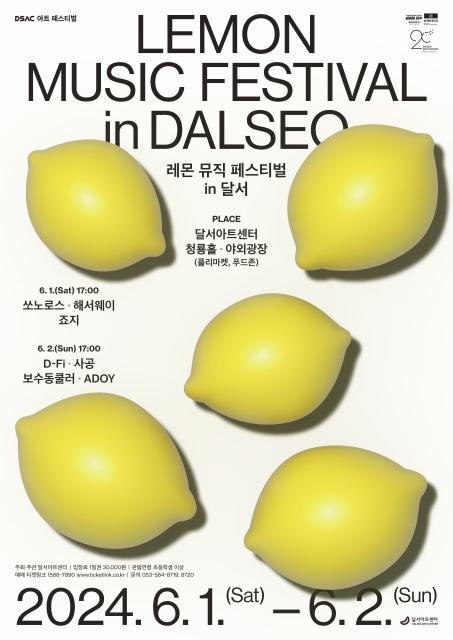 국내 인디 뮤지션의 음악을 즐길 수 있는 대구 달서아트센터의 '레몬 뮤직 페스티벌 in 달서'가 6월 1일과 2일 이틀간 열립니다.달서아트센터 청룡홀과 야외광장에서 열리는 '레몬 뮤직 페스티벌 in 달서'에서는 국내 인기 뮤지션 죠지, 아도이와 보수동쿨러, 해서웨이, 싱어송라이터 사공을 만날 수 있습니다. MZ 세대 취...