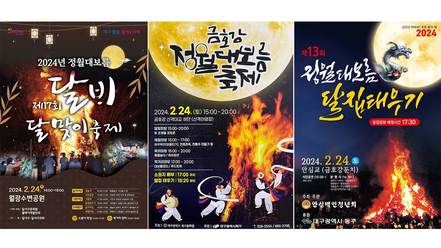 사진 제공 대구 달서구, 북구, 동구2월 24일 정월대보름 행사가 대구 곳곳에서 열립니다. 대구 북구 금호강 산격대교 둔치에서 열리는 '2024 금호강 정월대보름 축제'에는 시민 등 3만 명가량 참석할 것으로 예상됩니다.풍물단 길놀이와 달집태우기, 소원지 쓰기, 민속놀이 등이 펼쳐집니다. 대구 달서구 월광수변공원에서...