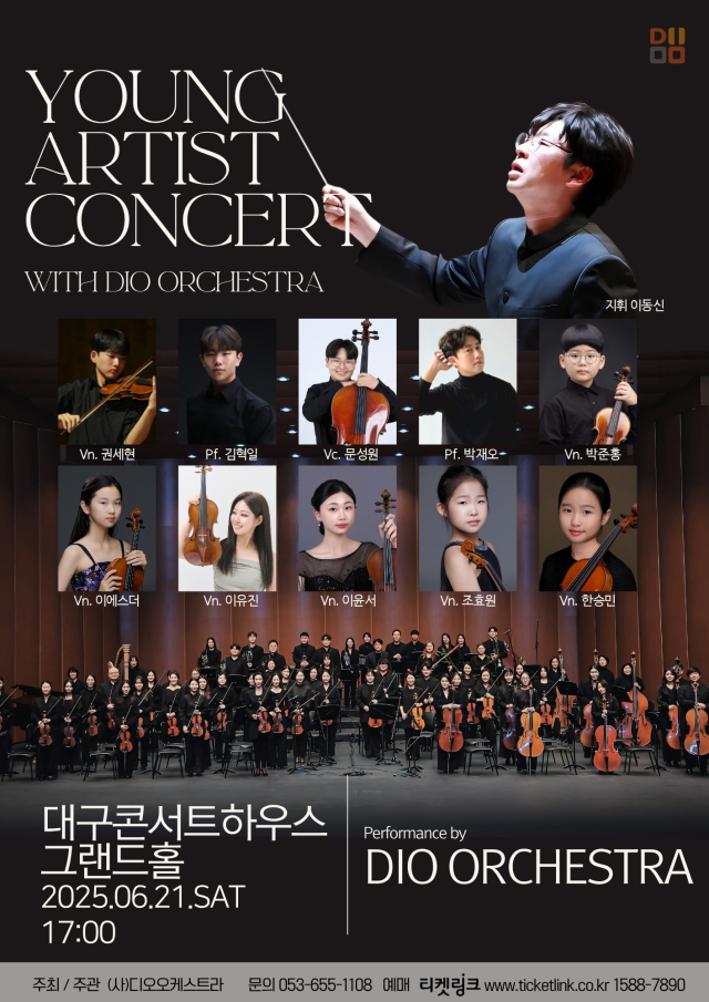 우리나라 하나뿐인 오페라 전문 오케스트라 디오 오케스트라가 여는 'DIO 영 아티스트 콘서트'가 오는 6월 21일 토요일 오후 5시 대구콘서트하우스 그랜드홀에서 열립니다.이번 콘서트는 '제1회 디오오케스트라 영 아티스트 콩쿠르'에서 입상한 차세대 클래식 유망 청소년들의 협연 무대입니다. 지휘는 국립 창원대학교 음...