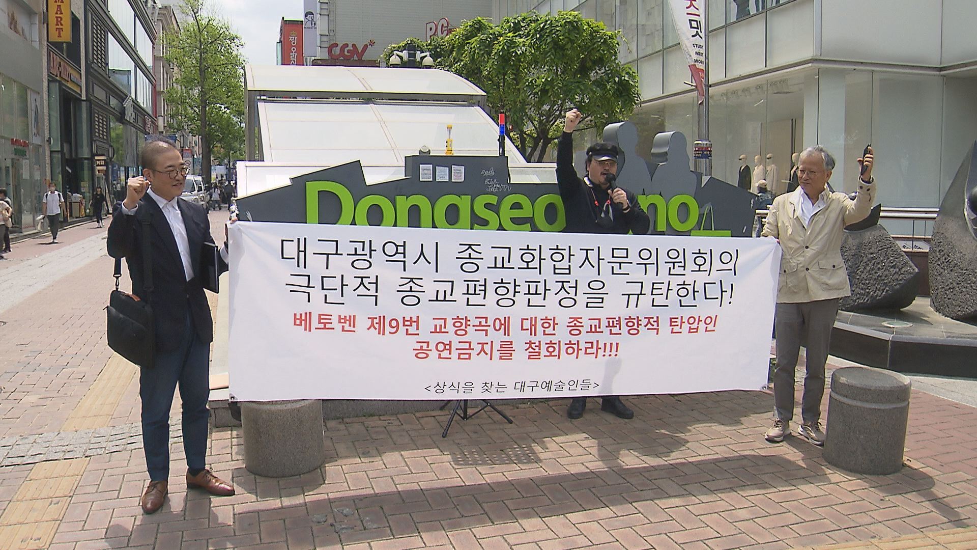 ◀앵커▶대구시 종교화합자문위원회가 베토벤 교향곡을 종교 편향적이라는 이유로 공연 금지했다는 어처구니 없는 소식, 전해드렸습니다. 지역 예술인들이 있을 수 없는 일이라며 거리로 나와 시위를 벌였습니다.실제 대구를 제외하고 다른 지역에서는 이런 사례를 찾아보기 힘든 실정인데요,예술의 자유를 침해하고 있다는 ...