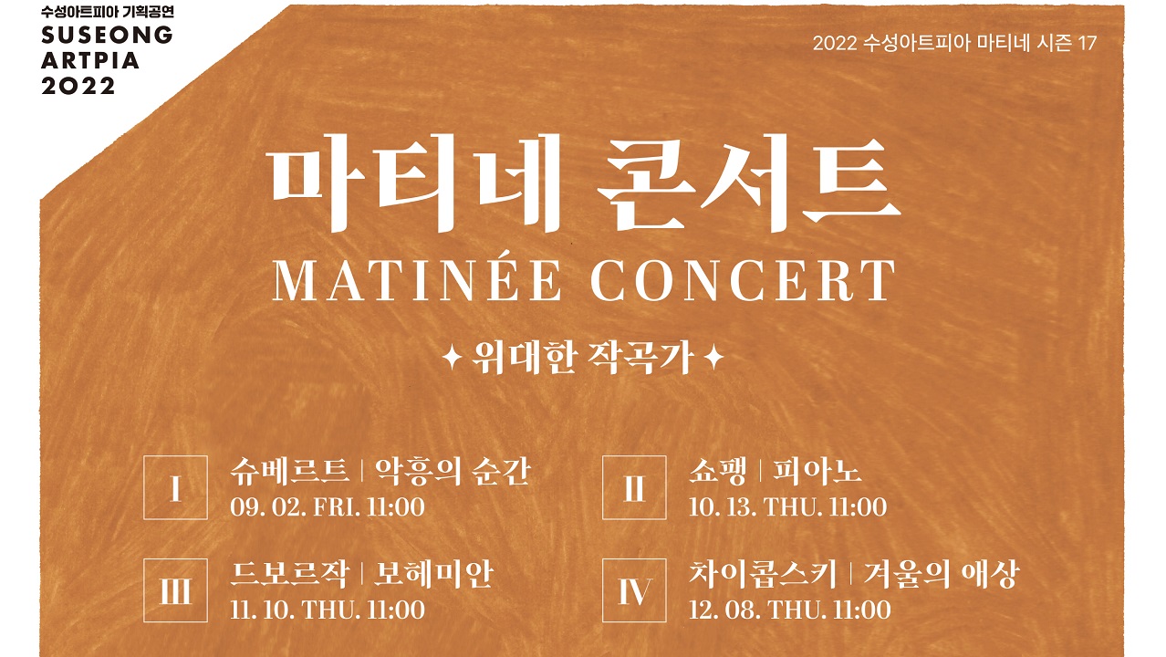 수성아트피아는 10월 13일 오전 11시 한영아트센터 안암홀에서 2022년 '위대한 작곡가' 시리즈 중 하나인 '10월 쇼팽의 피아노'를 공연합니다.쇼팽의 즉흥곡 네 곡 가운데 가장 명랑하고 경쾌한 곡인 즉흥곡 제1번과 서정적이면서도 극적인 곡들로 구성된 발라드 전곡을 선보일 예정입니다.이번 공연에는 국내와 북미, 유럽...
