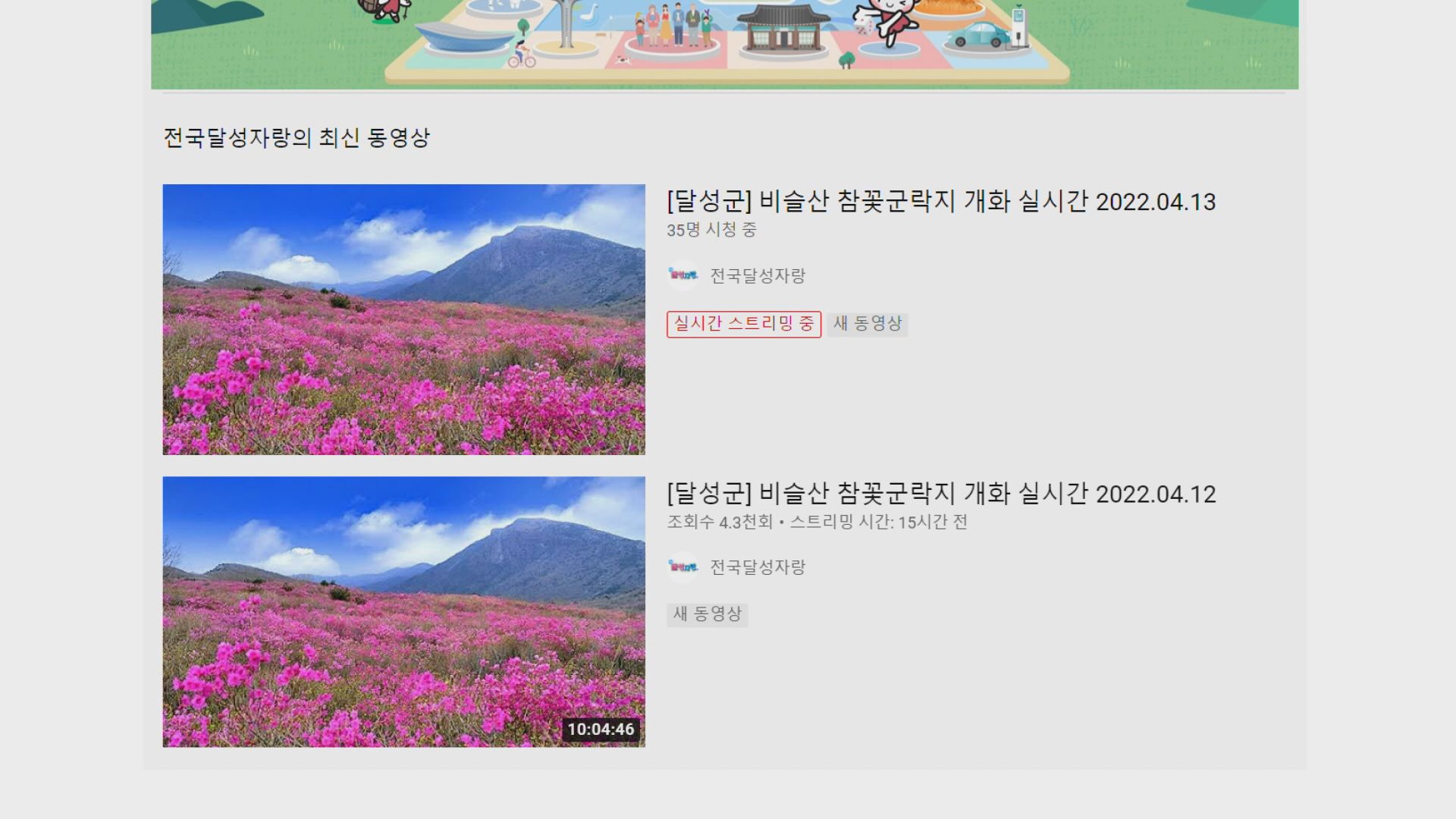 대구 달성군이 비슬산 참꽃 군락지 풍경을 온라인으로 중계합니다.군청 유튜브 채널 '전국달성자랑'에서 매일 오전 8시부터 저녁 6시까지 참꽃이 만개한 모습을 실시간으로 볼 수 있습니다.해발 1,084m 비슬산 정상부에 위치한 99만㎡ 규모 참꽃 군락지는 해마다 4월이면 진분홍 참꽃이 만개해 절경을 이룹니다.달성군은 "...